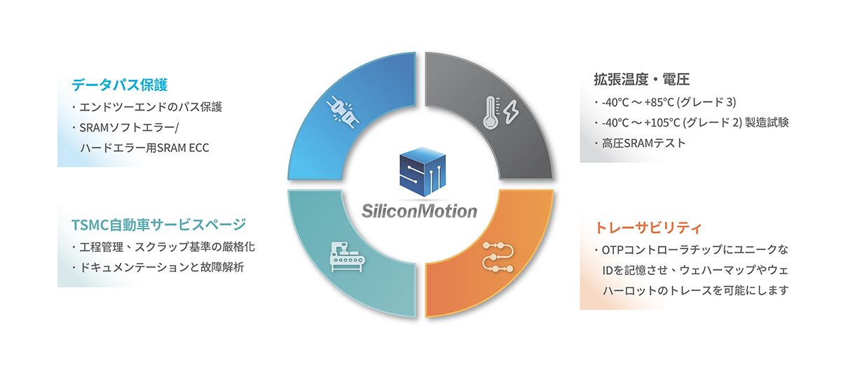 当社の車載用フラッシュ製品はすべて、AEC-Q100準拠、ISO26262、IATF16949認証によるサプライヤーチェーン認証、ASPICE準拠SW開発プロセスなど、業界とお客様が求める基準を満たすための厳しいテストを受けています。さらに、Silicon Motionは、製品供給期間を長くして、追加の認証コストを削減します。