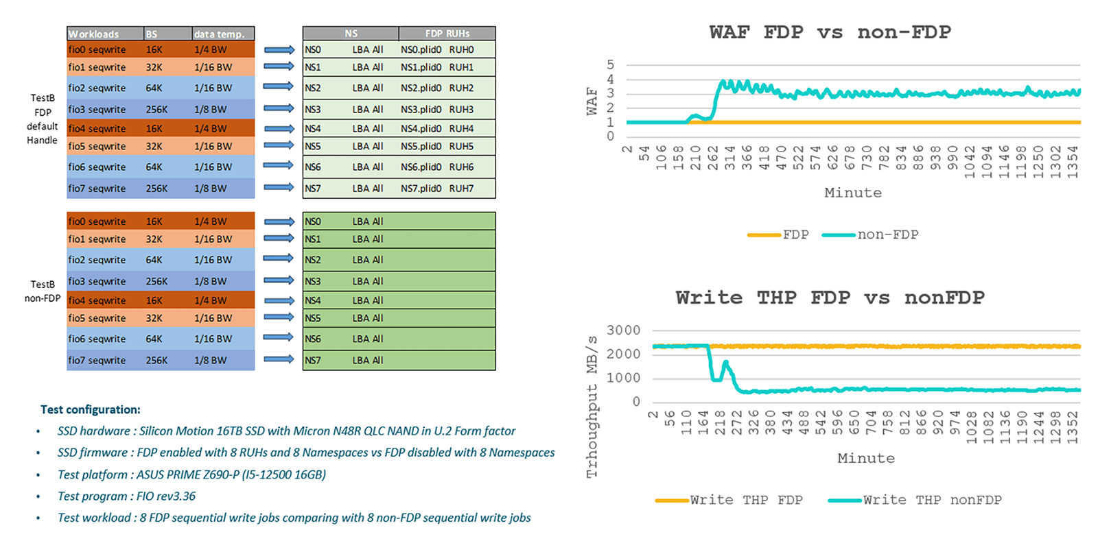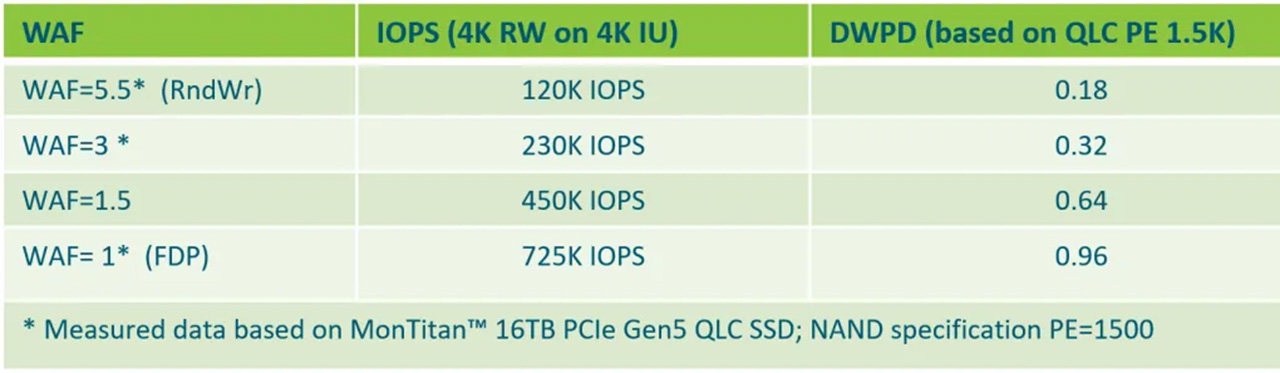 - 改善每日全盘写次数(DWPD):同样地,FDP 有助于增加 DWPD,SSD 可以在特定条件下达到 0.96 的 DWPD。