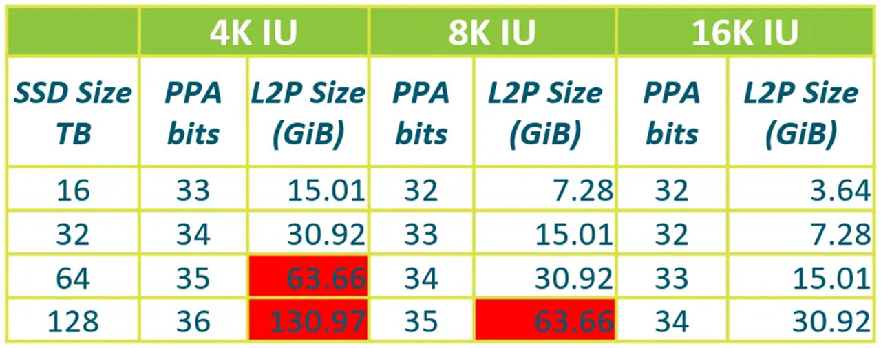 - 利用硬件辅助的位打包L2P条目进一步节省L2P表空间。例如,使用 33 位条目(而不是 40 位)来寻址 8G IU,可进一步将 L2P 的大小减少到 17.5%。