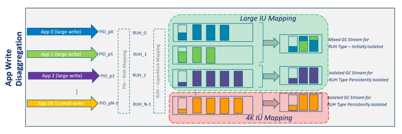 - 减少大 IU 上小写入造成的 WAF,支持 4K IU 的 RUH 和 16K IU 的 RUH。应用程序可将小规模写入放在 4K IU 的 RUH 上。