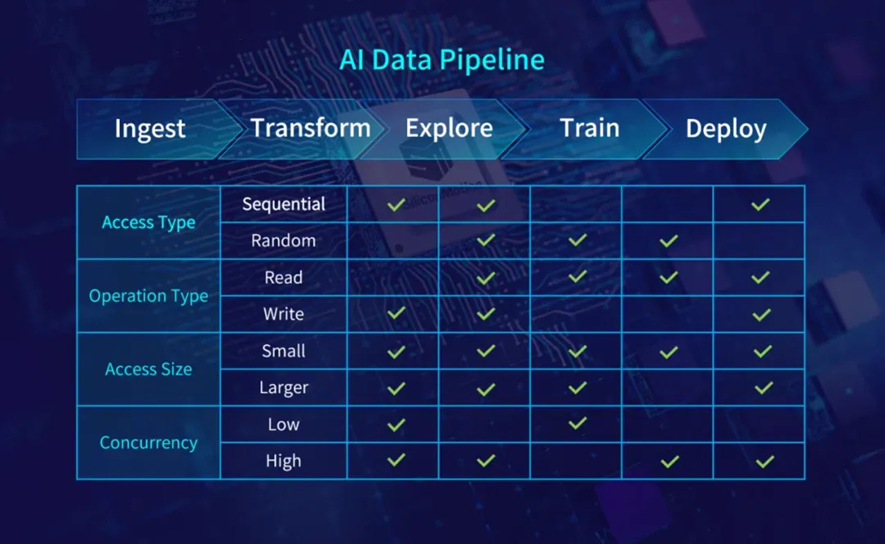 QLC以其大容量和高能耗比等特点,成为当前读取密集应用场景的重要选择。但在AI服务器中,数据处理包含采集、准备、训练及推理等过程,在这一流程中存在着存取类型多样(如顺序读写与随机存取)、操作类型复杂(读、写、更新)、存取大小不一(小块数据与大文件混合)以及并发性等特征。