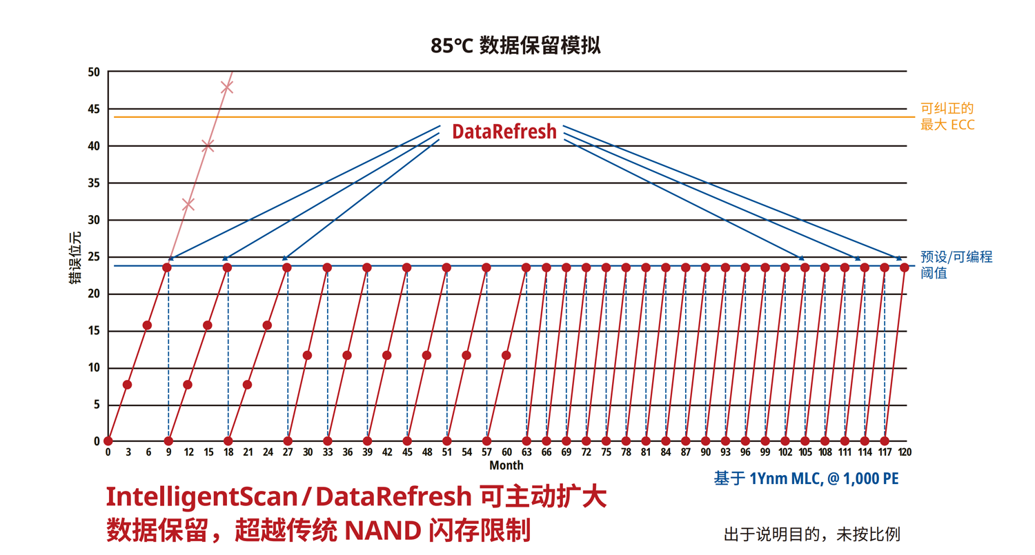 通过独家的 IntelligentScan 智能扫描功能,可依据主机读写行为与工作环境的变化 (例如温度),自动启动扫描作业,检测 NAND 内存区块与单元的状况,并结合 DataRefresh 功能,自动修复或替换存在失效风险的闪存单元, 维持整体存储设备的可靠性与稳定性。IntelligentScan 功能还可搭配 FerrSSD 内置的温度传感器工作,当检测到工作温度升高、NAND 内存失效风险随之提高时,自动提高扫描频率,降低因温度升高导致存取错误的机率。 通过 IntelligentScan 与 DataRefresh 功能的结合,不仅可适应高温带来的数据丢失风险,也能预防读取干扰问题, 降低因存储单元过于频繁的读取循环,导致邻近单元超载、产生位错误的机率(图五)。