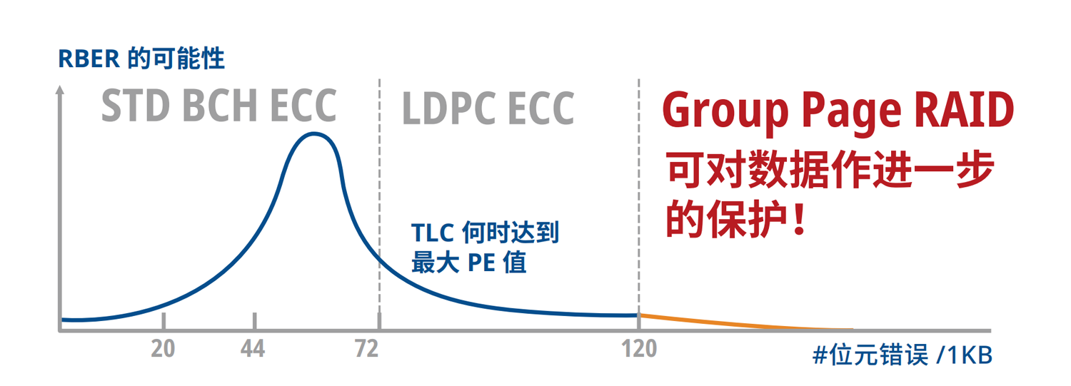 Ferri 嵌入式存储全都内建了 ECC (错误修正码) 功能,可以帮助修正写入错误,并延长 NAND 内存寿命。Ferri-eMMC 提供基本的 BCH ECC 引 擎,Ferri-UFS 提供进阶的 LDPC ECC 引擎,而 FerriSSD 则提供专属的 NANDXtend® ECC 引擎, 除了通过标准 BCH 与 RS ECC 引擎提供第一层修 正外,又结合 SMI 第四代 LDPC 与 Group Page RAID 算法,提供高效率的第二层修正架构,进一步提升保护能力(图四)。