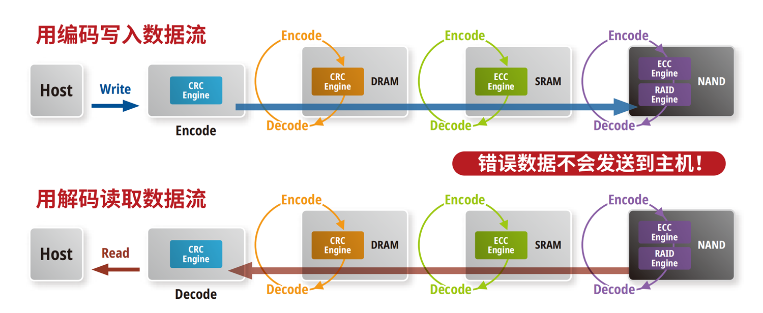 FerriSSD 可通过复原引擎提供了完整的数据错误检测能力,在整个“主机至 NAND 至主机”的数据路径中提供增强 的数据完整性,数据复原算法可检测 SSD 数据存取路径中各个环节出现的错误,从硬件 (即 ASIC)、固件,NAND 内存,到 SRAM、DRAM 缓冲存储 器等,通过 CRC 检测验证数据传输 的正确性,排除数据存取传输过程 中出现的错误(图三)。