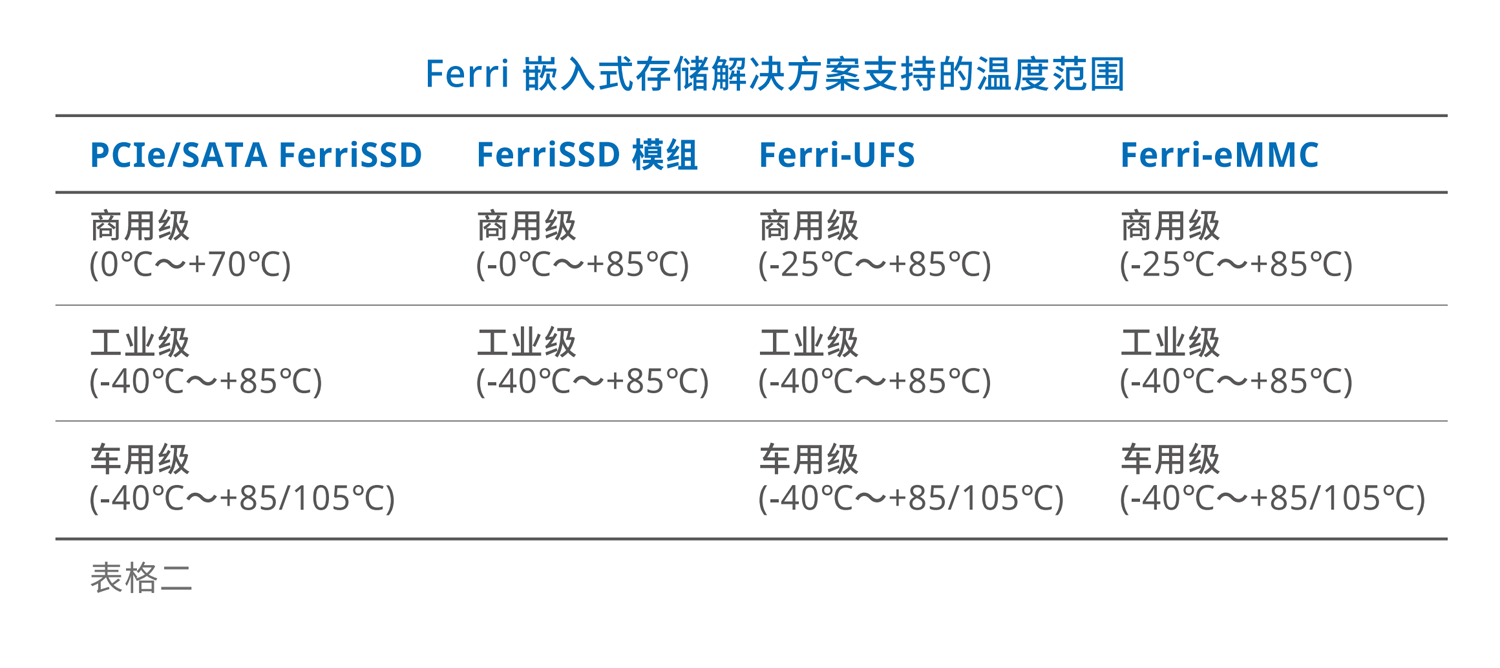 基于 NAND 闪存的固态存储设备,由于没有活动部件和具备抗震的特性。但 NAND 闪存的写入寿命与数据保存能力,受环境温度极大的影响,环境温度越高,写入寿命与数据保存能力也随之急剧缩短。Ferri 嵌入式存储提供了商用级、工业级和最苛刻的车用等级的工作温度支持能力,而 FerriSSD 更引进同类型产品首见的散热片设计,足以在数字监控系统各种可能的工作温度中稳定工作(表格二)。