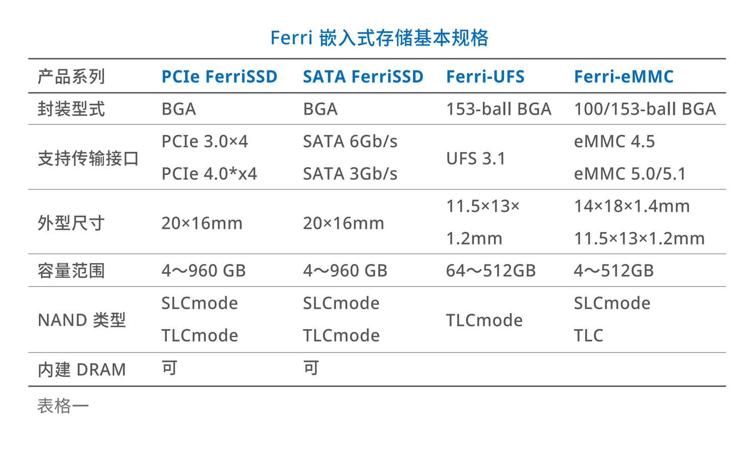另外,Ferri 嵌入式存储提供基于 SLCmode 或 TLCmode 等不同等级 NAND 闪存的规格选项,可适应用户不同的性能与成本取向,并拥有 4~32GB 的小容量规格,可满足低成本的要求。针对有较高性能需求的用 户,FerriSSD 系列也提供内嵌 DRAM 的高性能规格(表格一)。