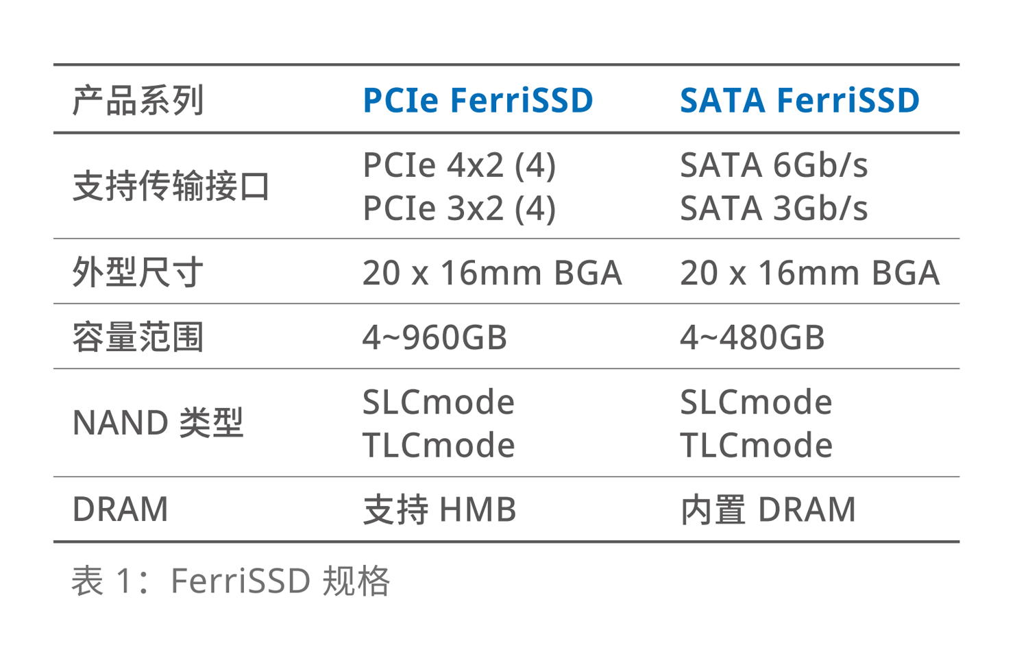FerriSSD 结合业界认证的主控芯片技术与慧荣科技针对环境危害和恶意威胁开发的先进保护技术,并将高可靠性的 NAND 闪存芯片和相关组件封装在坚固的 BGA 封装中。