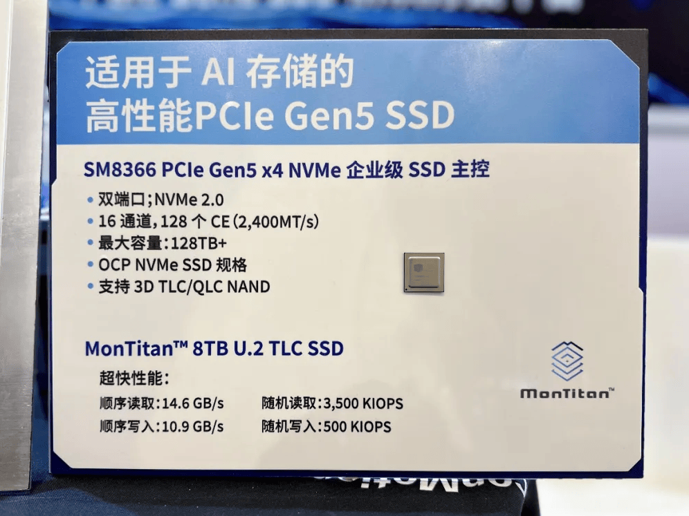 针对 AI 存储的大容量和高性能需求,慧荣科技展示了 MonTitan™平台中专为高性能计算环境设计的 PCIe Gen5 SSD。采用 SM8366 PCIe Gen5 x4 NVMe 企业级 SSD 主控芯片,具备高达 14.6GB/s 的顺序读取速度和 3.5M IOPS 的随机读取速度。容量方面更是能够达到 128TB 以上,可从容面对大规模数据集和复杂算法运算,是构建高效能数据中心的理想选择。