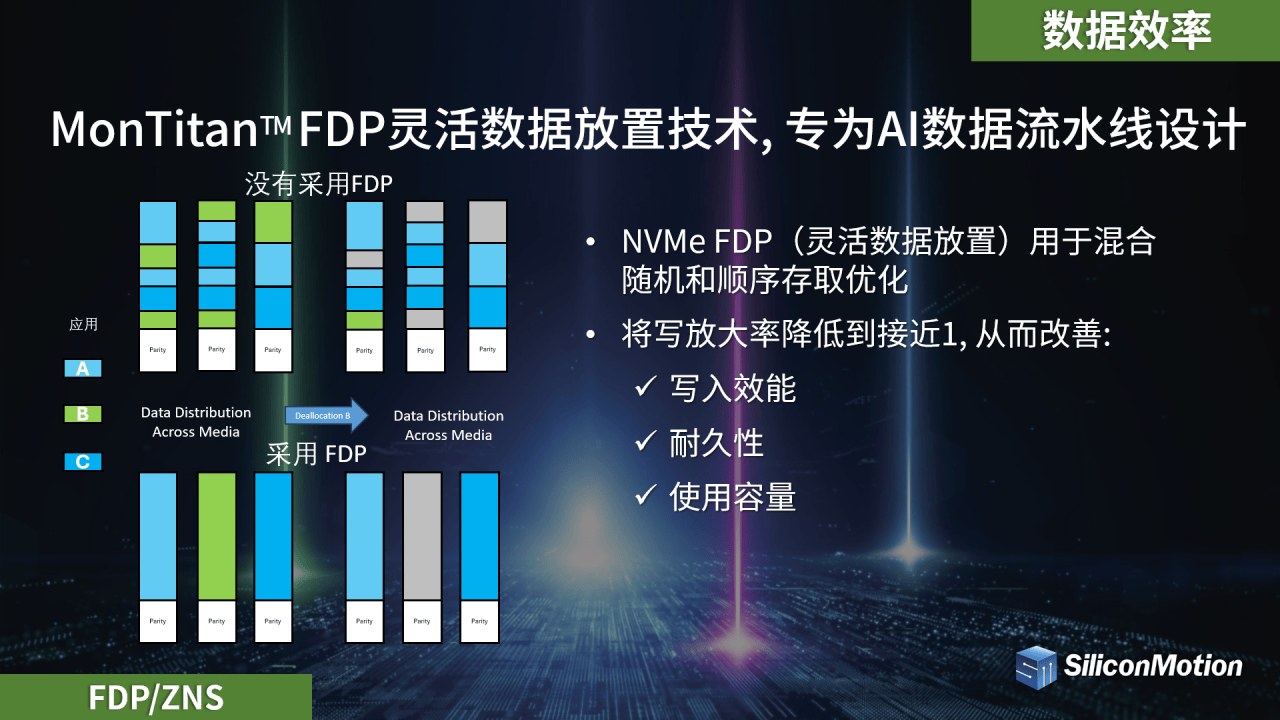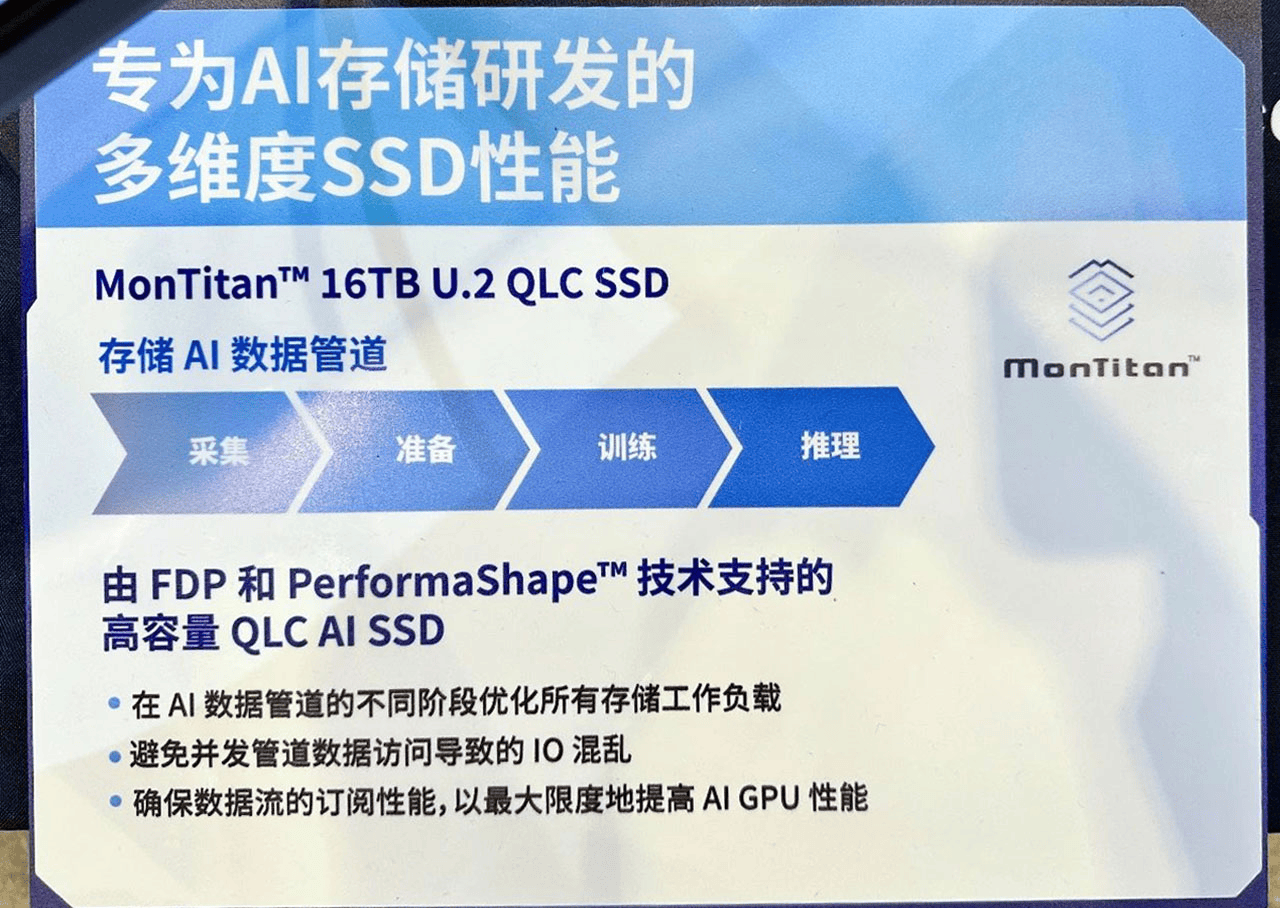 为让用于 AI 应用的存储设备性能更佳化,慧荣科技于 MonTitan™开发平台中的大容量 QLC SSD 引入了 FDP(Flexible Data Placement 灵活数据放置)技术和独家的 PerformaShape™技术,以提升大规模数据集处理效率,通过智能管理实现资源的最优分配,让数据在 AI 管道的不同阶段都能高效地被存取应用。