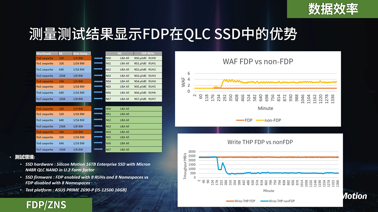 在慧荣科技测试中,使用 FDP 技术,可让 WAF(写入放大因子)显著减少,接近于 1。在整个写入数据的过程中,FDP 技术实现了高速度的同时,让写入速度更加平稳。