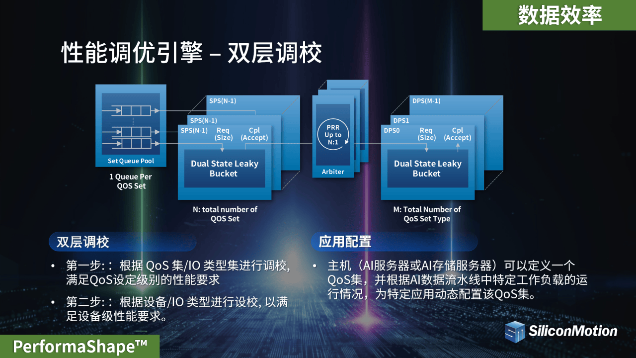 PerformaShape™技术则是支持用户自定义 QoS 集,如(性能、功耗、延迟等),通过性能调优引擎进行双层调教,结合 AI 数据管道中特定工作负载的运行情况,为特定应用动态配置该 QoS 集。