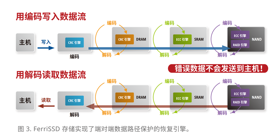 数据完整性是一项关键要求,而电信应用中的存储需将数据完整性提升至最高水平。对于一般的应用,SSD 仅在前 端主机接口和后端 NAND 接口上执行错误检测。这使得在其他位置(如内部 SRAM、 DRAM 传输缓冲区和其他电路通道)发生的错误不会被检测到。 FerriSSD 含有全面的数据恢复引擎,为整个“主机至 NAND 至主机” 数据路径提供更强的数据完整性。该算法能够高效地检测到 SSD 数据路径中的任何错误,如硬件错误、固件错误和内存错误,包括软错误位等难以检测的错误。