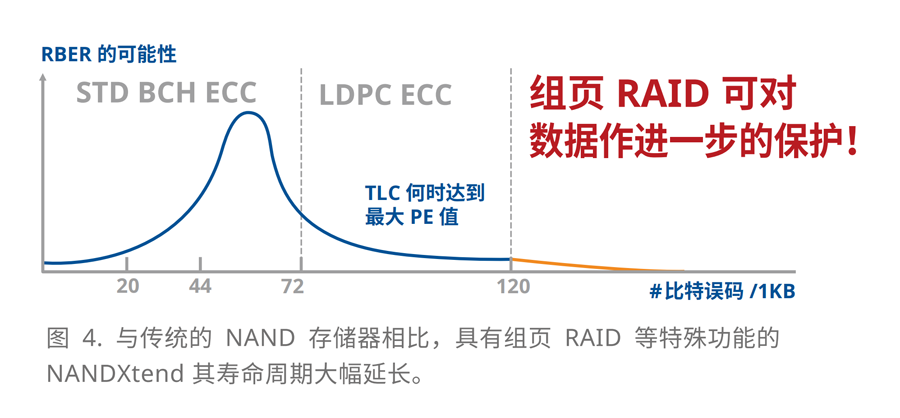与传统的 SSD 相比,FerriSSD 具有额外的优势,包括 NANDXtend® ECC 引擎,以及专有的 IntelligentScan 和 DataRefresh 功能。 NANDXtend 实现了有效的第二层纠错,优于传统的使用 NAND 转换-读取-重试的首层纠错。它使用低密度奇偶校验 (LDPC) 编码和组页 RAID 算法(图 4)以进行冗余备份。组页 RAID 将不可纠错的机率降至最低,并延长了 SSD 的服务寿命。