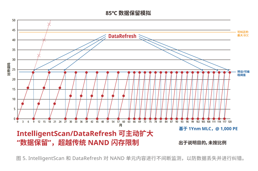 IntelligentScan 和 DataRefresh (图 5)可防止传统的 NAND 闪存中因大量的编程/擦除 (P/E) 循环而发生的数据丢失。它们共同对 FerriSSD 单元块进行自动评估,并根据需要刷新或收回单元块,以防这些数据丢失。在较高的环境温度下,扫描频率将自动增加以优化数据损失防护。专利的监控算法记录了关键因素,包括累积的结点温度读数、 P/E 循环数、SSD 开机时间及其它基本参照点,以动态选择和优先处理要进行 DataRefresh 的 NAND 单元。
