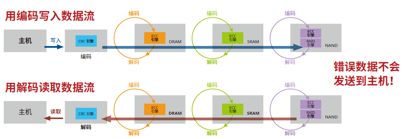 FerriSSD 提供强大的错误检测与恢复功能,全面保障“主机至 NAND 至主机”的数据完整性。其数据恢复算法能够检测硬件、固件以及内存(SRAM、DRAM、NAND)中的错误,确保系统在任何情况下都能提供可靠的性能。