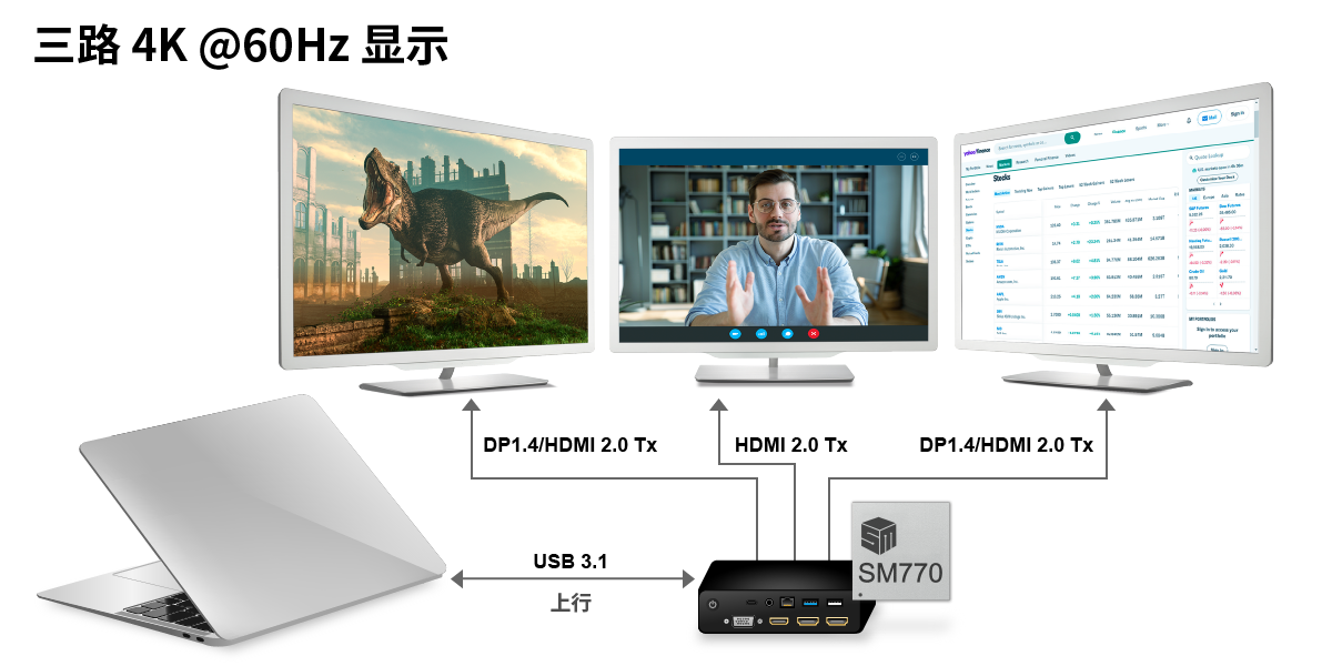 慧荣科技的SM770 是一款高性能 USB 显示接口 SoC,支持多达三台4K 超高清 (3840x2160@60p) 显示器同时连接。基于慧荣科技创新的 CAT™(内容自适应技术),采用多种图像和视频处理算法来压缩显示数据,同时最大限度地减少带宽使用,从而实现从计算机到显示器的超低延迟。CAT™ 技术将大部分压缩工作转移到硬件加速器上,可以更高效地运行并降低 CPU 负载。