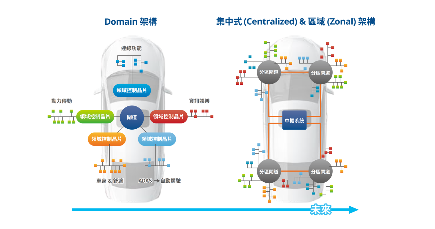隨著汽車對電子控制及軟體定義功能的依賴日益增加,傳統以 Domain 架構為基礎,為每一種功能都配置專門控 制單元的方式,正逐漸被 Zonal 架構取代。Domain 架構按 Domain 分組,像是車內動力系統、底盤、資訊娛樂 等,以至於車輛上的車載 ECU 增加許多,這也增加了佈線的複雜度。Zonal 架構將 ECU 根據其在車內的位置進行規劃,由中央處理器統一處理各個區域控制器 (ZCU) 回傳的資料,其尺寸大小足以處理來自車內數個 ECU 運算的工作負載。這可減少 ECU 數量與簡化佈線,進而節省空間並減輕車輛重量。