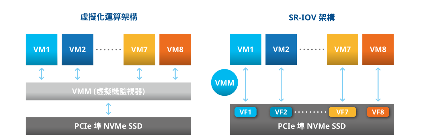 圖 2:SR-IOV 架構使虛擬機器 (VM) 能與 PCle 埠 NVMe SSD 直接進行數據傳輸,簡化資料傳輸過程以降低延遲。