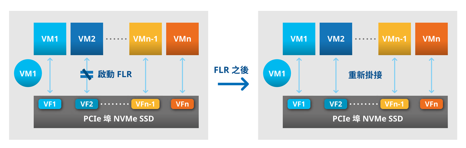 確保隔離。功能層級重設 (FLR) 可重新設定個別的 SR-IOV 功能,以確保當虛擬機器失效時可進行重設,並使用 FLR 重新連接 SSD,而不影響其他虛擬機器與虛擬功能。