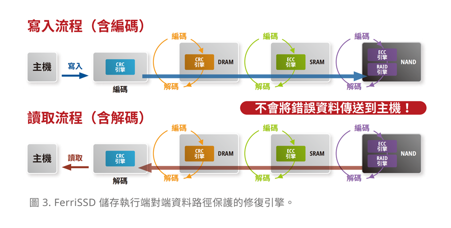 資料整合為關鍵需求,電信應用則需要最高層級的儲存。一般應用所使用的 SSD,只能在前端主機介面與後端的 NAND 介面執行,但有時仍會產生錯誤偵測。導致其他像是內部 SRAM 與 DRAM 轉換緩衝及其他電路路徑等位置, 發生的錯誤未被偵測到。FerriSSD 搭載全資料修復引擎,在整個「主機至 NAND 至主機」的資料路徑中提供增強 的資料整合(圖 3)。其演算法能有效地偵測 SSD 資料路徑中的任何錯誤,像是硬體錯誤、韌體錯誤與記憶體錯誤 等,也包含難以偵測的錯誤,例如軟錯誤 bits 。