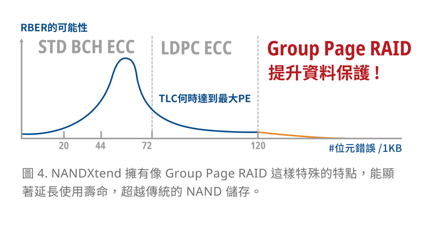 NANDXtend 能執行有效率的第二層級修正,超越使用 NAND 轉換-讀取-重試的傳統第一層錯 誤修正。使用 LDPC (低密度奇偶修正碼)和 Group page RAID 演算法(圖 4),作為備援備份。Group page RAID 大大減低了發生未能被修 正錯誤的機會,也延長了 SSD 的使用壽命。