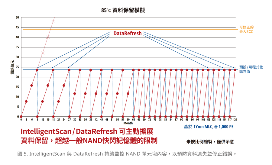 IntelligentScan 與 DataRefresh (圖 5)能預防在大量寫入/抹除(P/E)循環積累時,於傳統的 NAND 快閃儲存 中會發生的資料遺失狀況。他們會一起自動估算 FerriSSD 單元塊,並在需要時重新整理或撤回單元塊,以防止資 料遺失。掃描頻率則在周遭環境溫度較高時會自動增加,使資料遺失預防的效率最佳化。專利的監控演算法會紀錄 包含累積接面溫度讀數、P/E 循環次數、SSD 開機時間與其他必要的參照點等關鍵要素,以動態選擇並排定需要進 行 DataRefresh 的 NAND 單元的優先順序。