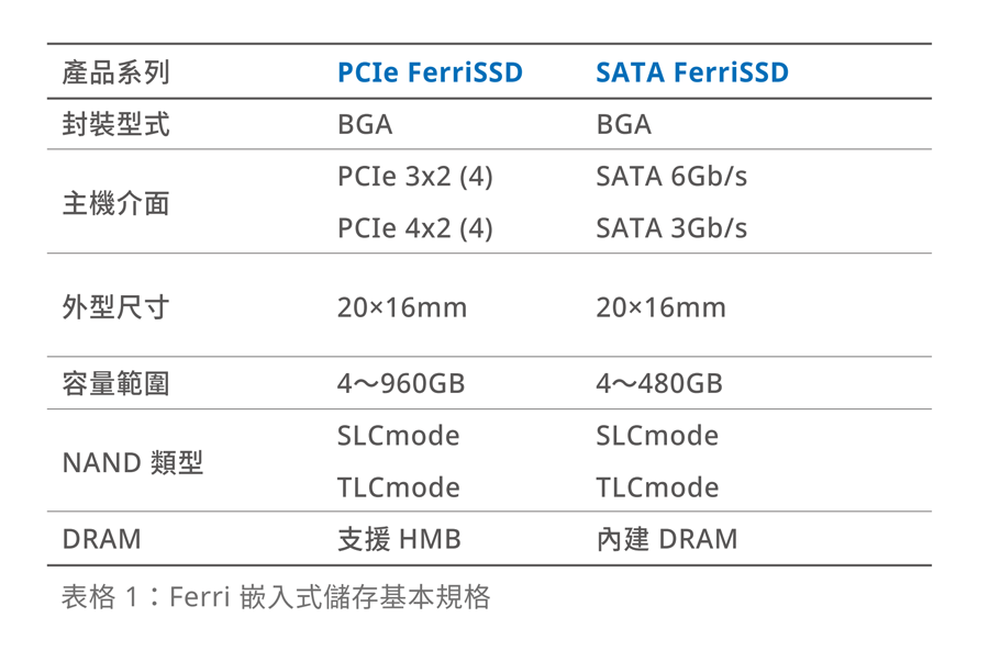 慧榮科技的 Ferri 嵌入式儲存解決方案,專為符合現今電信網路要求的多樣且嚴苛的需求而規劃設計。透過內建的 保護機制,獨特專利的創新來延長使用壽命及微調效能,並且符合產業最高標準的網路安全防護,在今日快速變化 的網路配置中,FerriSSD 儲存系列是相當堅固且耐用的。