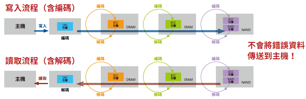 FerriSSD 提供強大的錯誤偵測和修復機制,確保「主機至 NAND 至主機」整體資料傳輸路徑的完整性。其資料復原演算法可有效偵測硬體、韌體和記憶體(SRAM、DRAM、NAND)中的錯誤,確保穩定且可靠的效能表現。