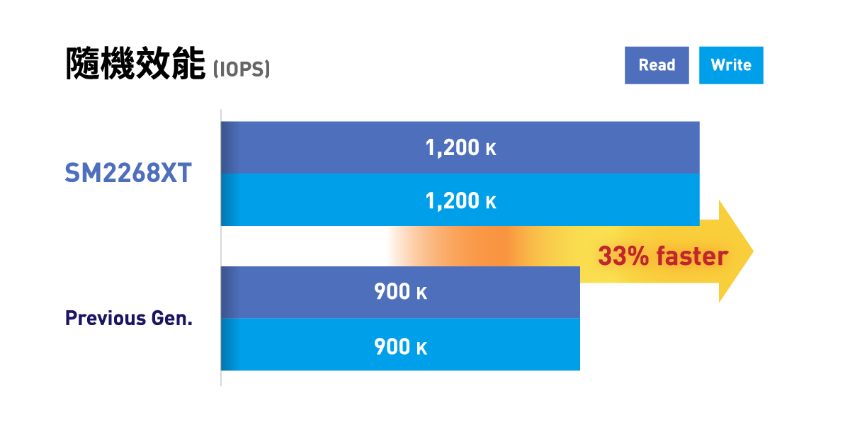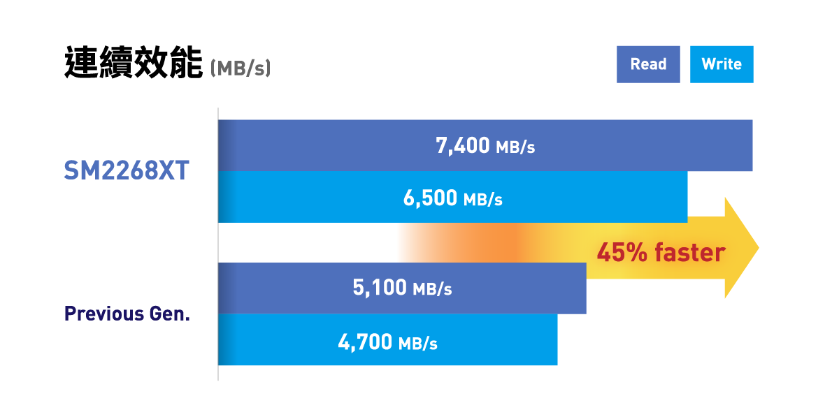 SM2504XT 採用 4 通道架構,支援高達 3600 MT/s 的資料傳輸速率,並具備 PCIe Gen5 x4 NVMe 2.0 介面。其效能可達每秒11.5 GB 的循序讀取、每秒11.0 GB 的循序寫入,以及高達 200 萬 IOPS 的隨機效能。