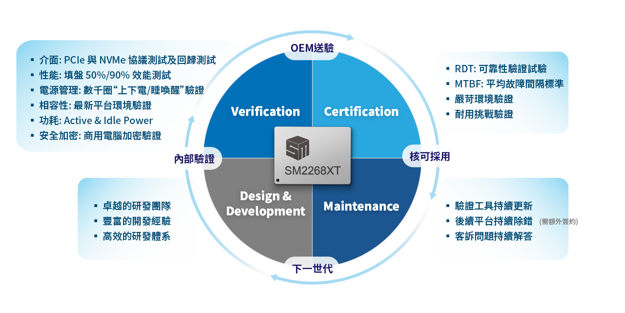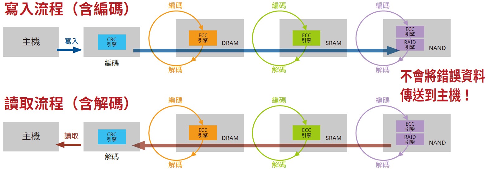 慧榮科技的 SSD 控制晶片解決方案整合了完整的資料錯誤偵測與修復引擎,能在「 主機至 NAND 再回到主機」的整個資料傳輸路徑中,提供強化的資料完整性保護。其資料修復演算法可有效偵測 SSD 資料路徑中可能發生的各類錯誤,包括硬體層(如 ASIC)的錯誤、韌體錯誤,以及來自 SRAM、DRAM 或 NAND 的記憶體錯誤。