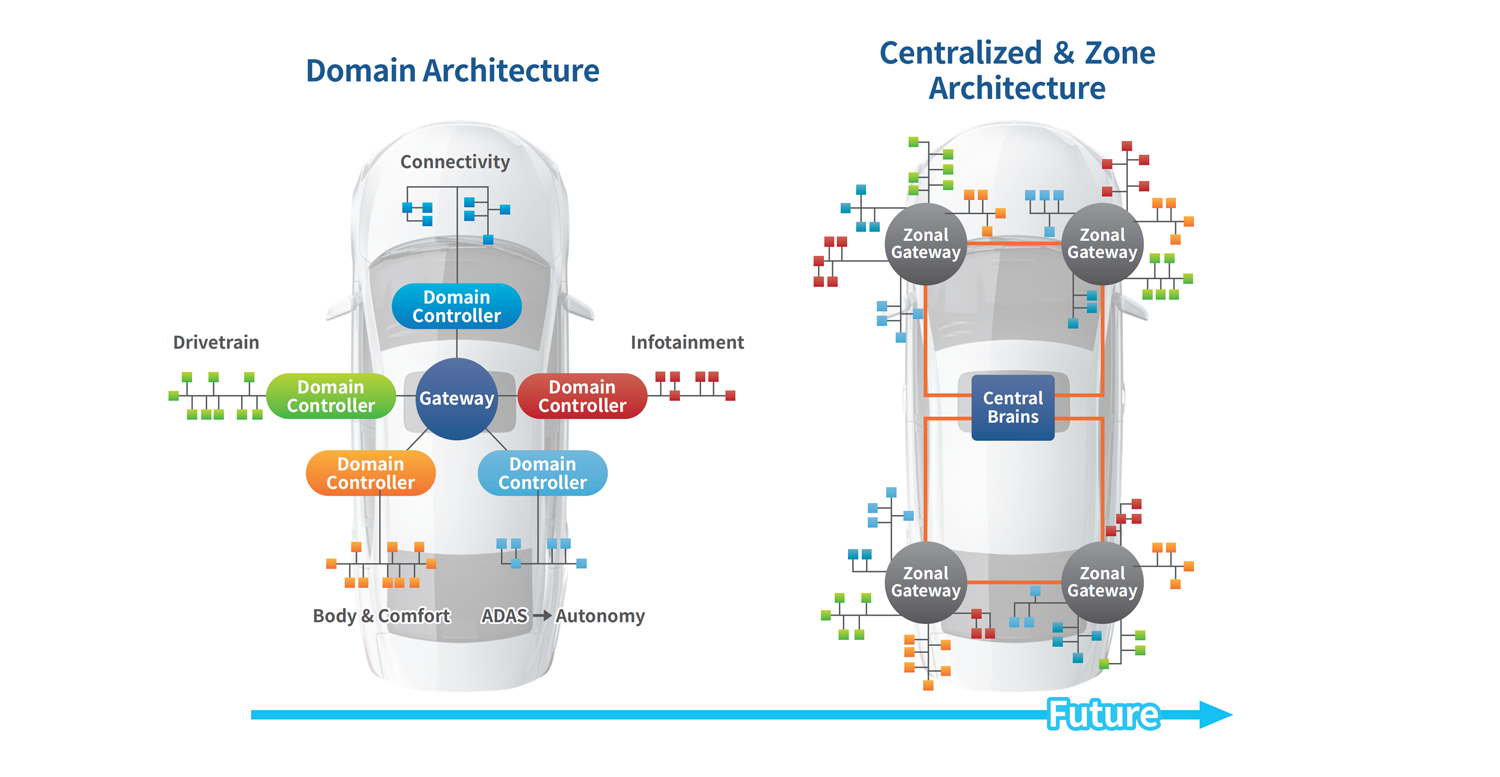 As modern vehicles rely increasingly on electronically controlled and software-defined functions, the typical domain-based electrical architecture that dedicates a control unit for each is giving way to a zonal approach. The domain approach, which groups functions by domain such as powertrain, chassis, and infotainment, has driven a rapid increase in the number of ECUs on board the vehicle as well as increased wiring complexity. The zonal approach, where ECUs are classified according to their location in the vehicle, contains a centralized communication gateway and compute module sized to handle workloads from multiple ECUs within the vehicle. It gives the opportunity to reduce the number of ECUs and simplify the wiring, permitting space savings and reduced vehicle weight.