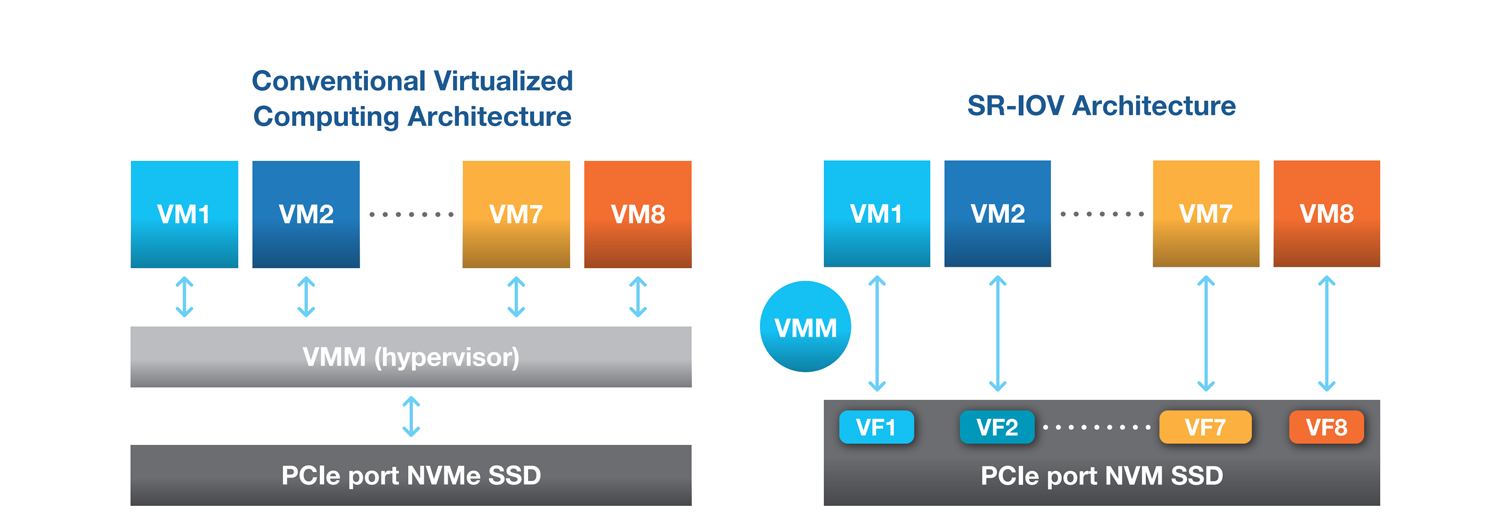 The key advantage of SR-IOV, as depicted in Figure 2, allows data to bypass the hypervisor layer, enabling direct data transfer between the virtual machines (VMs) and the PCIe port NVMe SSD. This direct path significantly reduces latency by eliminating the data allocation between PCIe and host, and it also lessens the computational load on the CPU that hosts the hypervisor.