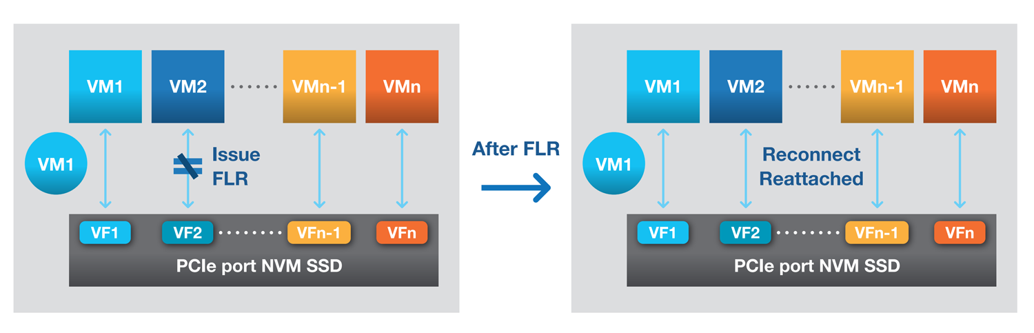 Isolation is ensured. The function-level reset (FLR) interface can reset the individual SR-IOV functions This ensures that, when a VM fails, it can be reset and using FLR to reconnect with the SSD without impacting other VMs and VFs.
