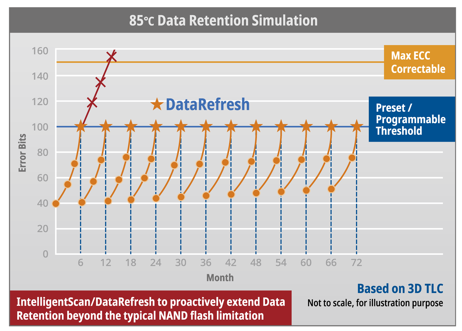 IntelligentScan™ with DataRefresh performs automatic scanning and repairs, ensuring that all data stored to the disk, at all times and at all locations including secure areas, can be read and written correctly. It increases the duration of data storage and extends the lifespan of the SSD (Figure 2).