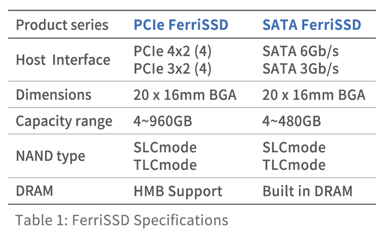 FerriSSD combines industry proven controller technology with Silicon Motion's advanced protection against environmental hazards and malicious threats, with highly reliable NAND Flash chips and associated components in a robust BGA package.