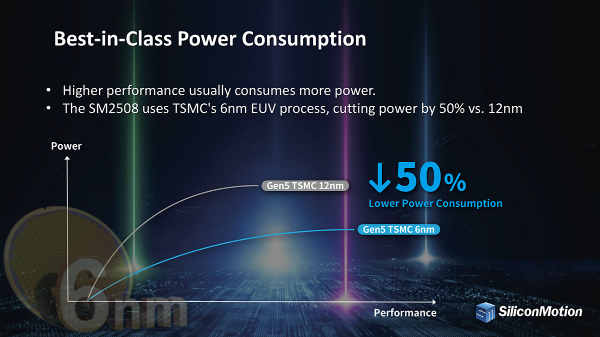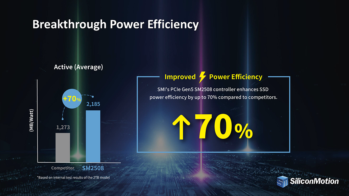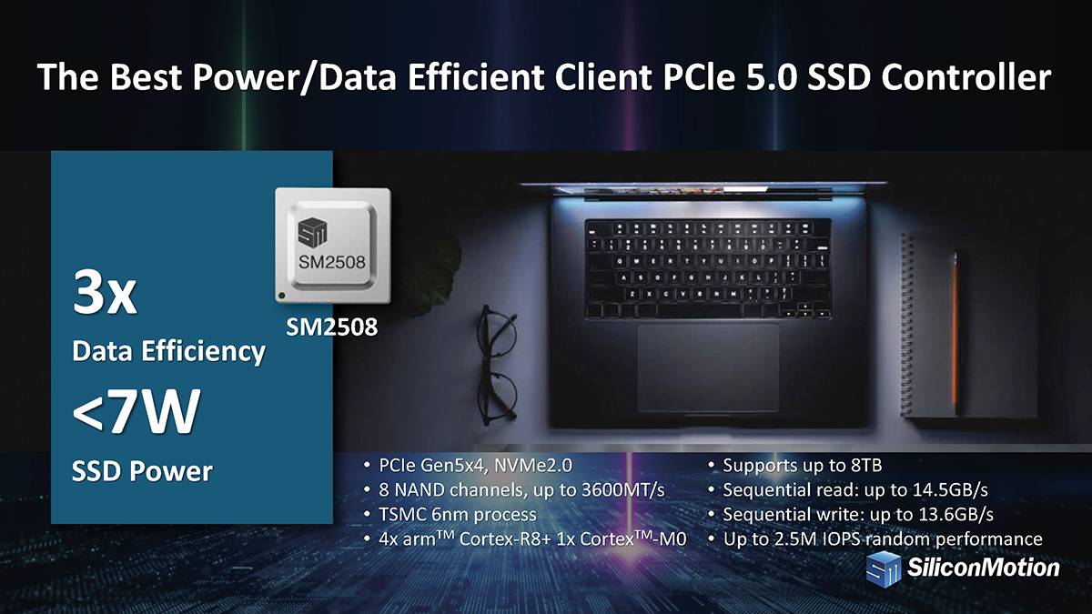 The SM2508 offers three times better data efficiency compared to previous models while consuming less than 7 watts of power. That's incredibly low power for the performance it delivers, and it is the best in the industry today. This controller features 8 NAND channels supporting up to 8TB capacity and can handle up to 3600 MT/s NAND speed- delivering sequential read speeds up to 14.5 GB/s, write speeds up to 13.6 GB/s and up to 2.5M IOPs. This represents an incredible combination of data efficiency and low power consumption. This controller is set to redefine what we expect from SSDs in terms of power efficiency and data efficiency: