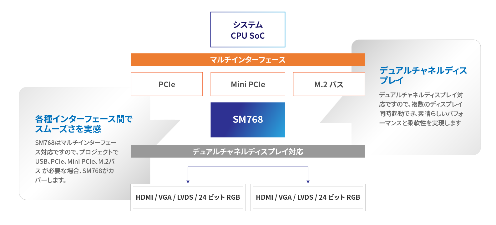 SM768はマルチインターフェースとデュアルチャネルディスプレイに対応していますので、産業オートメーションからデジタルサイネージまで様々なアプリケーションの最高のチョイスになります。