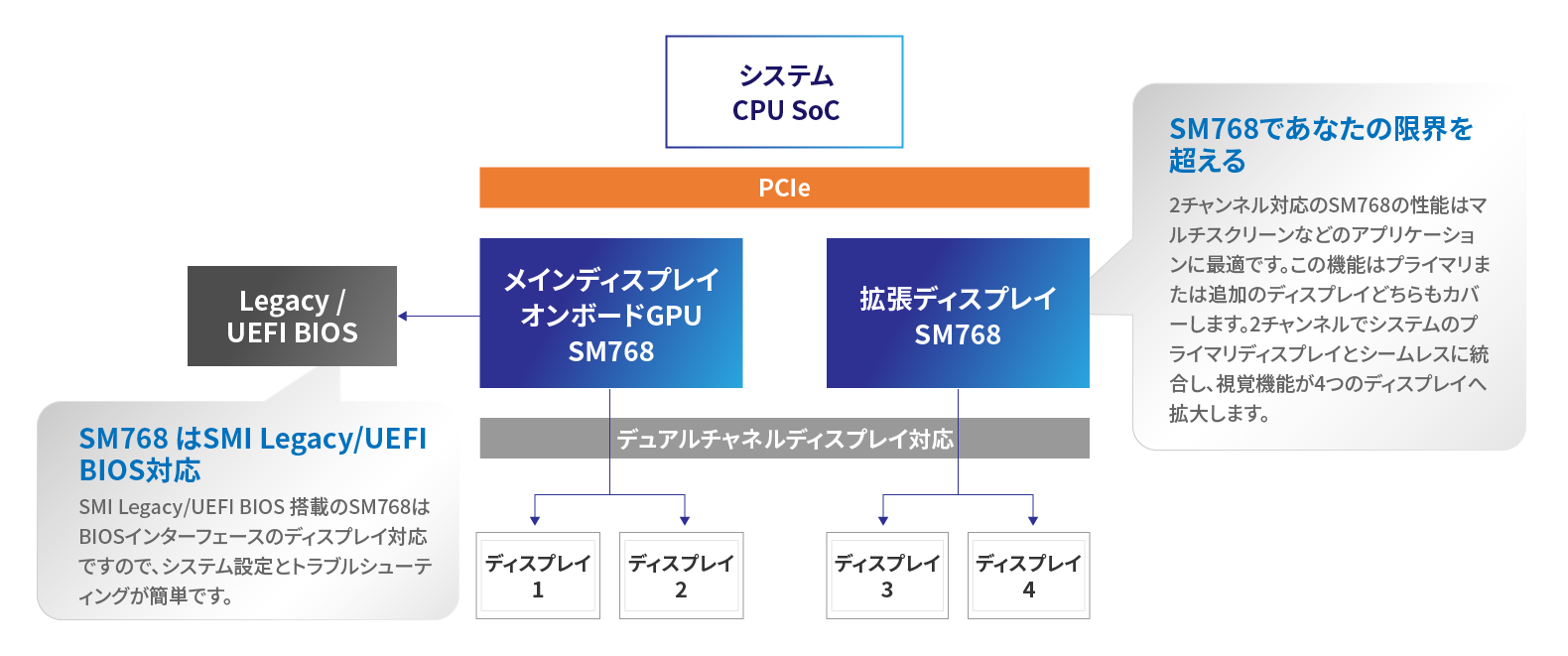 SM768は多機能性で他の追随を許しません。SMI Legacy/UEFI BIOSでプライマリディスプレイへ統合する場合も、拡張ディスプレイとして使用する場合もSM768がカバーします。
