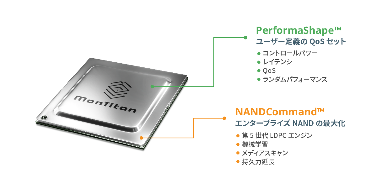 MonTitan™は、次世代データセンターおよびエンタープライズストレージ用途に向けて設計されており、パフォーマンス、信頼性、安全性のすべてにおいて業界最高レベルの水準にあります。 カスタマイズ可能な包括的ファームウェアソリューションを通じて、顧客がアプリケーションに最適化された、差別化されたSSDソリューションを柔軟に開発することが可能です。