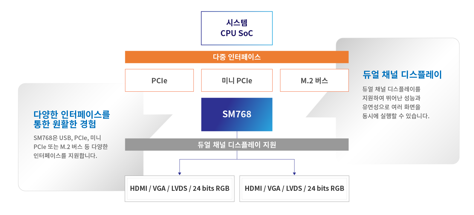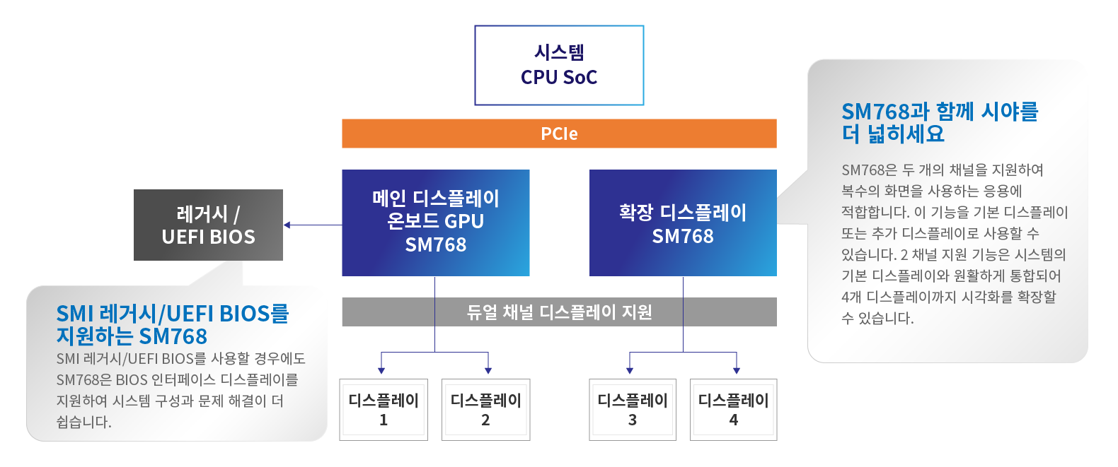 SM768의 다재다능함은 비교가 불가합니다. 기본 디스플레이 그래픽 SoC로 SMI 레거시/UEFI BIOS와 통합하거나 확장 디스플레이로 사용할 경우에도 SM768은 완벽히 지원합니다..