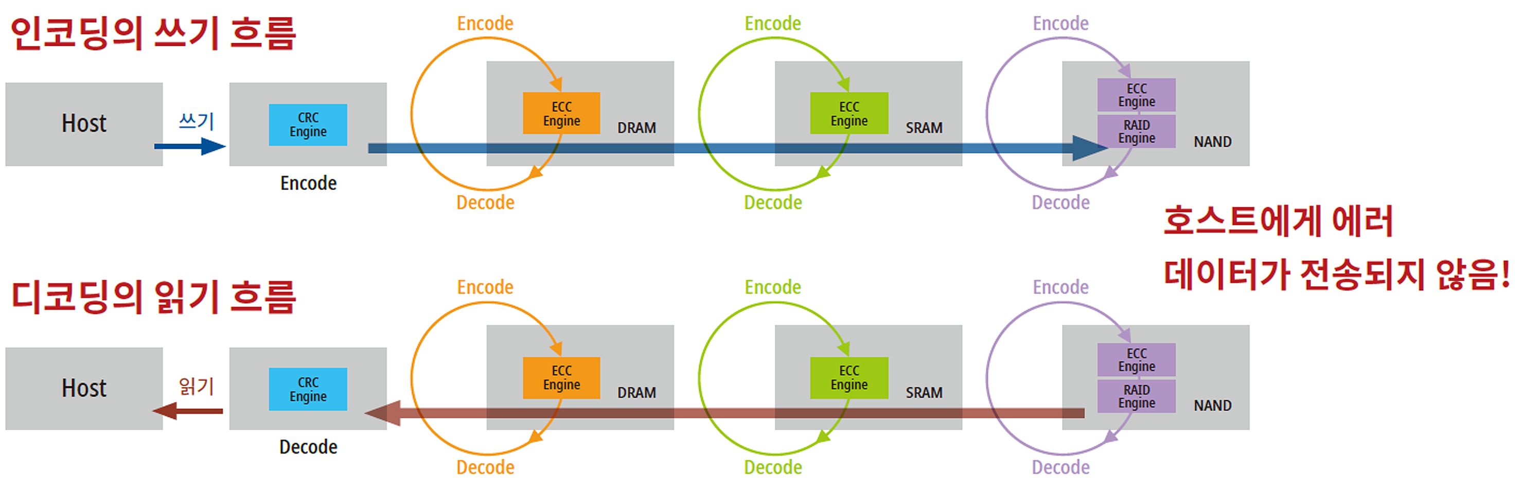 FerriSSD는 강력한 오류 검출 및 복구 기능을 제공하여 전체 Host-to-NAND-to-Host 경로에 걸쳐 데이터 무결성을 보장합니다. 데이터 복구 알고리즘이 하드웨어, 펌웨어, 메모리(SRAM, DRAM, NAND)의 오류를 검출하여 성능의 신뢰성을 보장합니다./p>