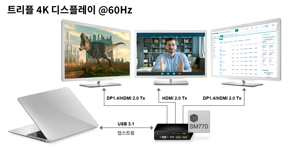 Silicon Motion의SM770은 Silicon Motion의 혁신적인 CAT™ (Content Adaptive Technology) 기술을 활용하여 세 개의 4K UHD(3840x2160@60p) 디스플레이를 동시에 지원하며 다중 이미지/비디오 프로세싱 알고리즘을 도입하여 디스플레이 데이터를 압축하고 대역폭 사용량을 최소화함으로써 컴퓨터에서 모니터로 초저지연 전송을 제공하는 고성능 USB 디스플레이 인터페이스 SoC입니다. CAT 기술은 압축 작업의 대부분을 하드웨어 가속기에게 맡겨서 더 효율적으로 작동하고 CPU 부하를 감소시킵니다.