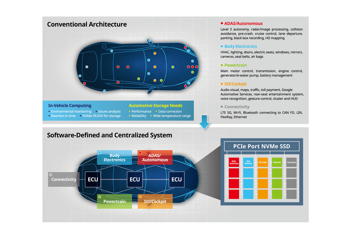 중앙 집중형 아키텍처는 차량 내 전자 시스템을 단일 관리 플랫폼으로 통합하며 이를 위해서는 고속 데이터 전송 시스템과 다양한 스토리지 애플리케이션이 필수입니다.