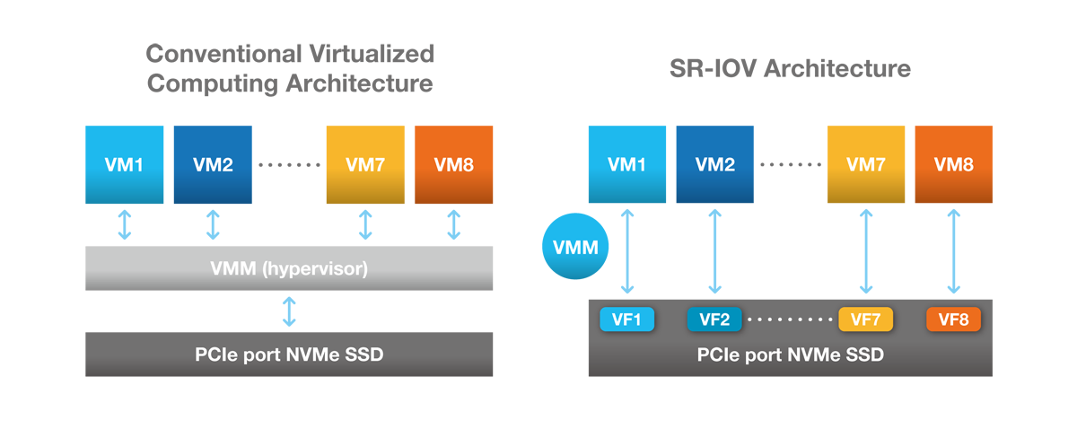 가상화 아키텍처의 가장 큰 장점은 데이터 전송 시 더 이상 하이퍼바이저(가상 머신 관리자, VMM)를 경유할 필요가 없다는 점입니다. 이로 인해 PCIe 포맷과 하이퍼바이저 포맷 간의 소프트웨어 변환으로 인한 지연이 제거되며, 하이퍼바이저가 실행되는 CPU의 부하 또한 줄어듭니다.