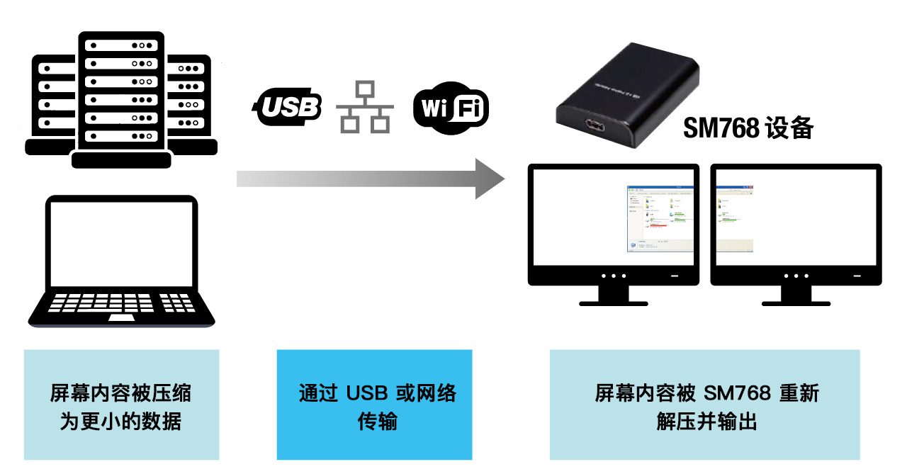 SM768 的 USB 扩展坞解决方案,结合高图形性能以及低功耗,搭载 CAT™(内容自适应技术)压缩技术提供高压缩率,同时对主机 CPU 降低处理负载。慧荣科技开发的技术 InstantView®,可让拓展坞的用户可以立即将计算机屏幕镜像到任何外接显示器,而无需安装显示驱动程序。