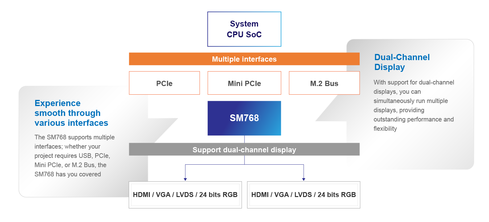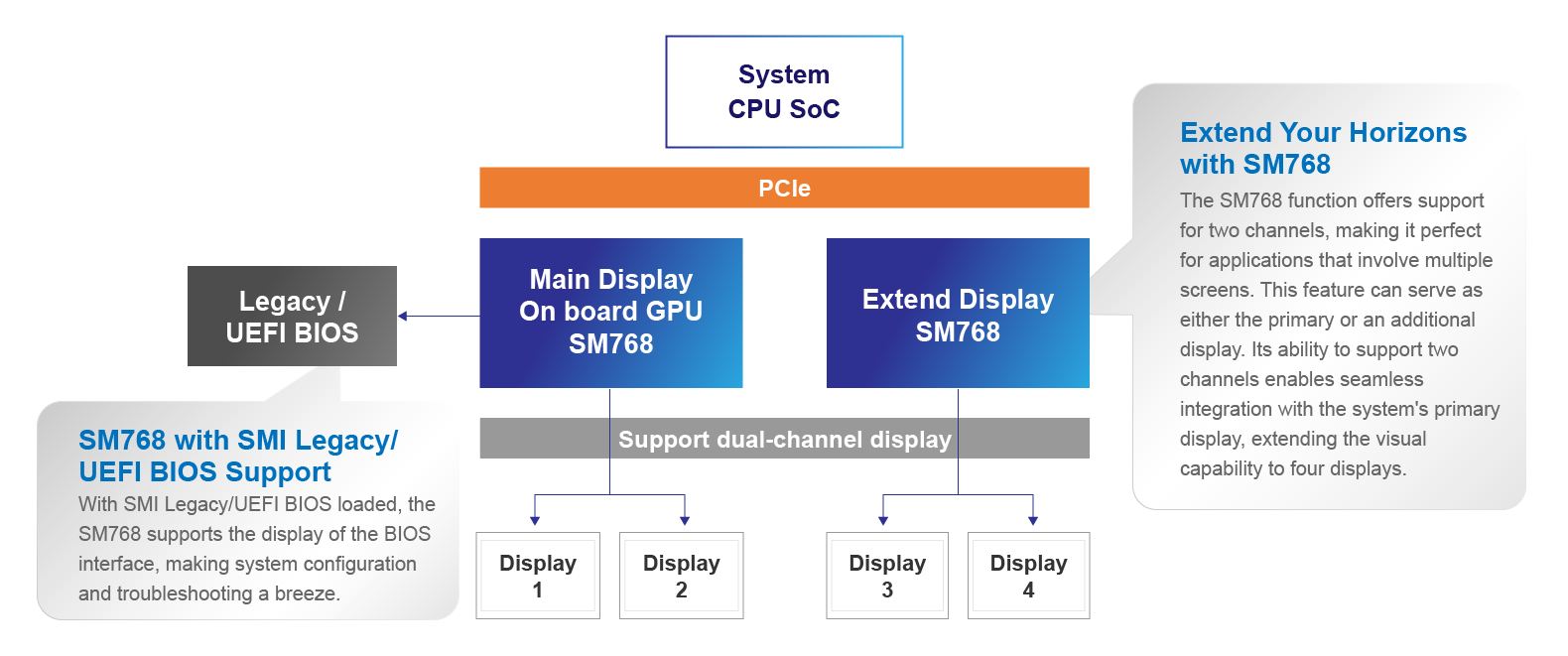 The SM768 offers unparalleled versatility. Whether you need to integrate it as the primary display Graphic SoC with SMI Legacy/UEFI BIOS or use it as an extended display, the SM768 has you covered.