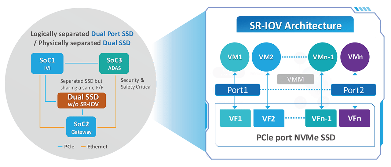 The world's first SSD controller specifically designed for automotive applications with support for Single Root I/O Virtualization (SR-IOV). This advanced controller supports up to eight virtual functions, significantly reducing the CPU's burden by efficiently managing multiple virtual machines that access the SSD simultaneously.